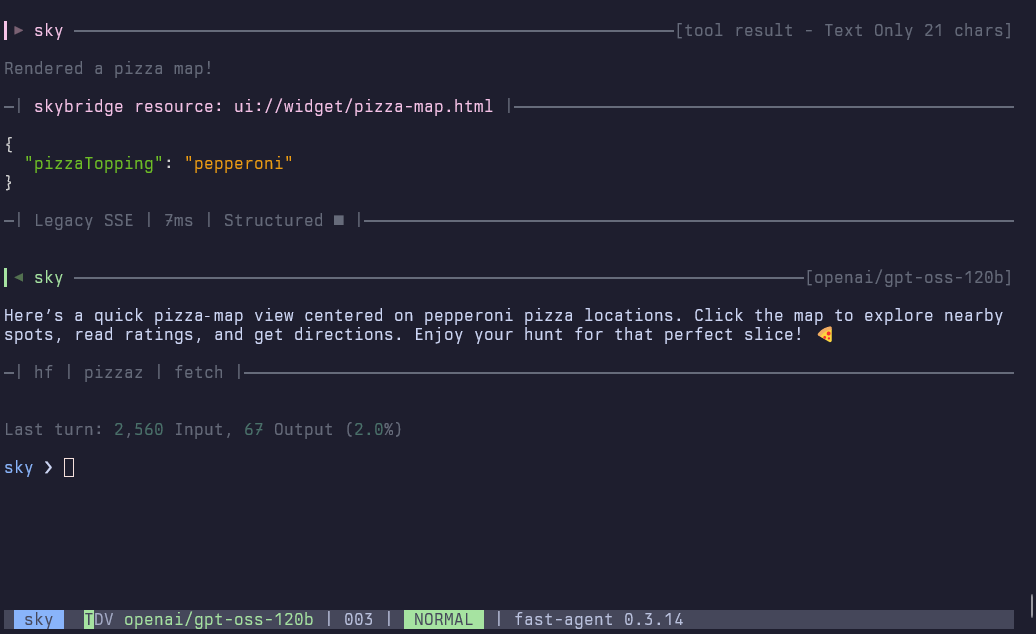 fast-agent automatically detects OpenAI Apps SDK (Skybridge) integrations exposed by MCP servers. Detection runs during tool/resource discovery: the aggregator looks for tools that publish an openai/outputTemplate _meta entry and the corresponding ui://… resources with the text/html+skybridge MIME type.